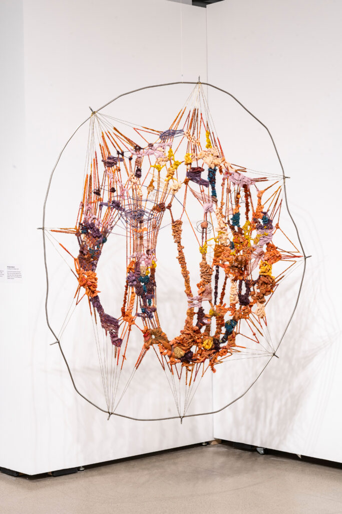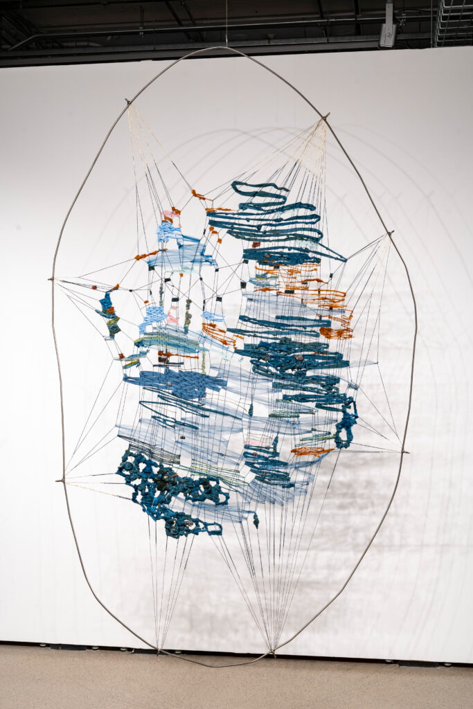 De Amerikaans kunstenaar Ellie Dale Anderson (1998) combineert geweven structuren, metalen armaturen en gevonden materialen tot textiele werken die de relaties tussen objecten en ruimte onderzoeken. Ze gebruikt weven als een model voor ecologische netwerken: net zoals mycelium bomen met elkaar verbindt, koppelt linnenbinding verschillende materialen tot een samenhangend geheel en onderzoekt Ellie hoe mensen en natuur met elkaar verbonden zijn.