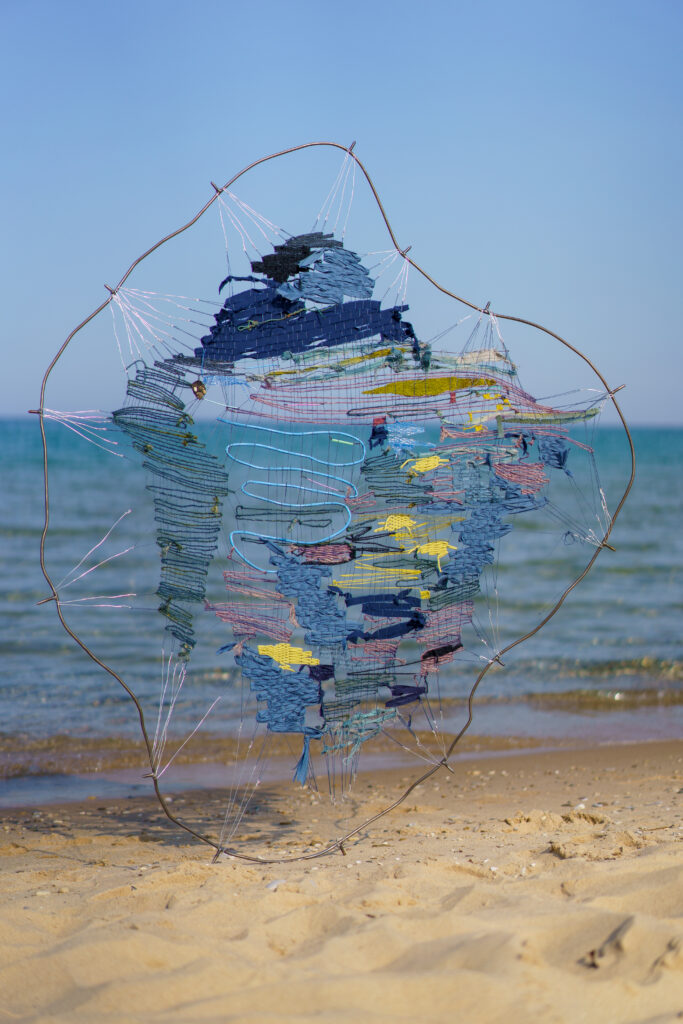 Gevonden materialen uit het dagelijks leven, zoals plastic uit Lake Michigan waar zij in de buurt woont, krijgen een nieuwe bestemming in Ellie’s werk. ‘Het afvalmateriaal verzamel ik dagelijks. Mijn handen functioneren als een zeef om te bepalen welke materialen ik wil gebruiken in het weefsel.’ Ook stoffen van haar grootmoeder worden opnieuw geïntegreerd in haar werken. ‘Mijn grootmoeders stoffen en knopen zijn essentieel; ze dragen haar waarden mee in het weefwerk.’ Samen met handgesponnen garens van wol, hennep en vlas ontstaat zo een textuur die zowel tactiel als narratief is.