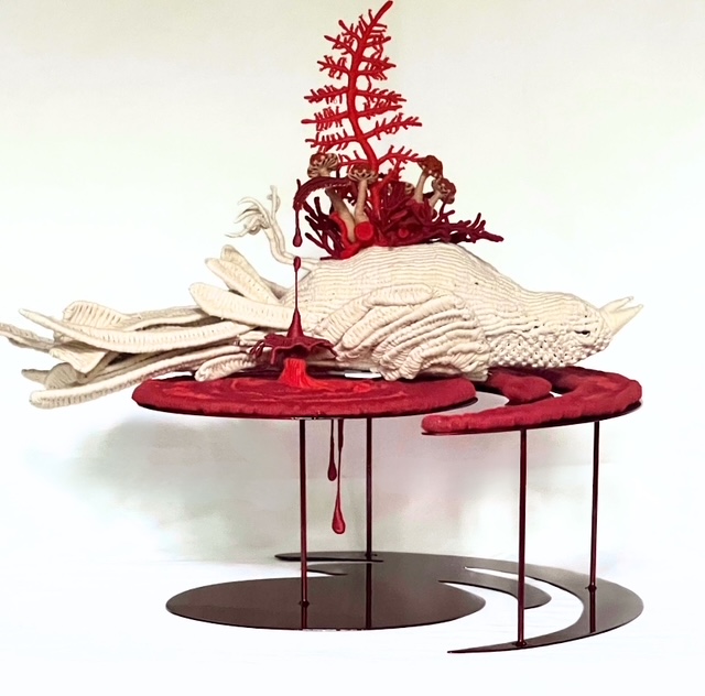 Haar sculpturen zijn organisch, industrieel en geometrisch. Een vis die oplost in inkt, een vogel die bedekt raakt door zwammen, of een bloem die uit een kluwen afval groeit – telkens staat een metamorfose binnen een gecontracteerde context centraal. ‘Ik werk graag binnen de gevaarlijke én veelbelovende zones waar deze drie elkaar overlappen.’