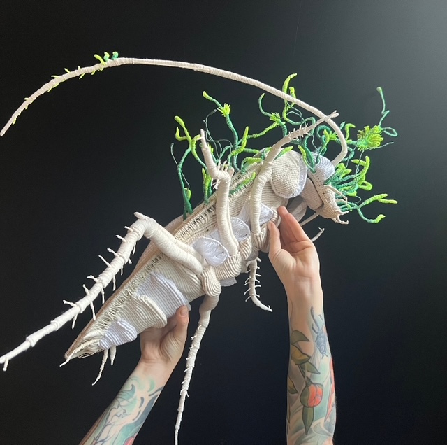 De Canadese kunstenaar Janis Ledwell-Hunt (1981) maakt werk van het residu van verschillende industrieën: textielafval, aangespoeld marien plastic en afgedankte metalen machineonderdelen. Materialen die anders op de afvalberg zouden belanden, worden in haar werk opnieuw ingezet om werkelijk en denkbeeldig relaties tussen mens en natuur tastbaar te maken. Zo onderzoekt deze fragiele verwevenheid te midden een tijdperk van ecologische crisis.