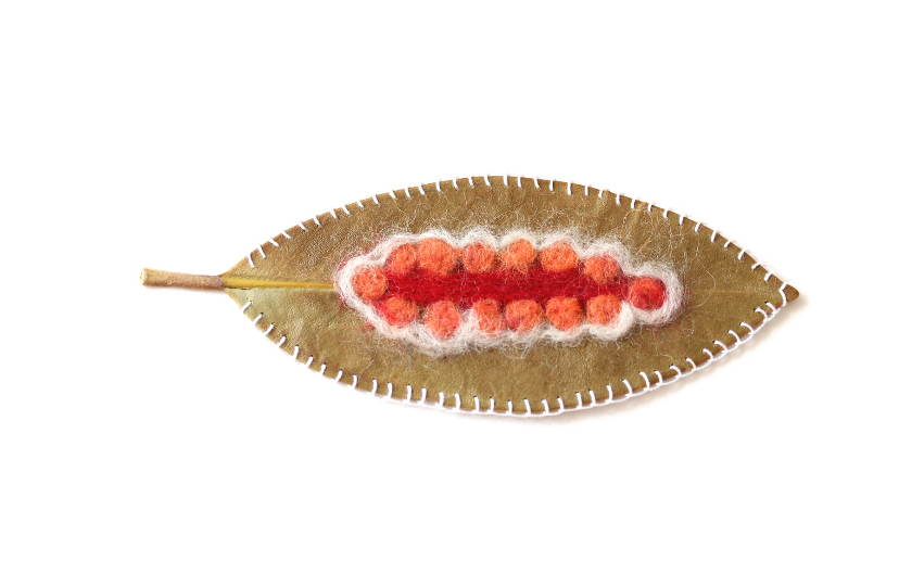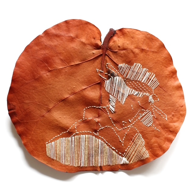 ‘Hier groeien struiken die niet veel vocht nodig hebben, zoals de Coccoloba uvifera (Zeedruif). Deze bladeren gebruik ik vaak als ondergrond in mijn werk. Andere soorten, zoals de bladeren van de magnolia, vind ik in bergachtige gebieden. Daarna volgt een grondig proces van selecteren, schoonmaken, persen en conserveren. Nadat ik de grootte van het blad, de kleuren, texturen en vormen heb geanalyseerd, begin ik met schetsen.’ Mónica gebruikt uiteenlopende technieken zoals haken, breien, kantklossen, schilderen en diverse materialen. Bijvoorbeeld draad, wol, vilt, zaden, takjes en bloemblaadjes.