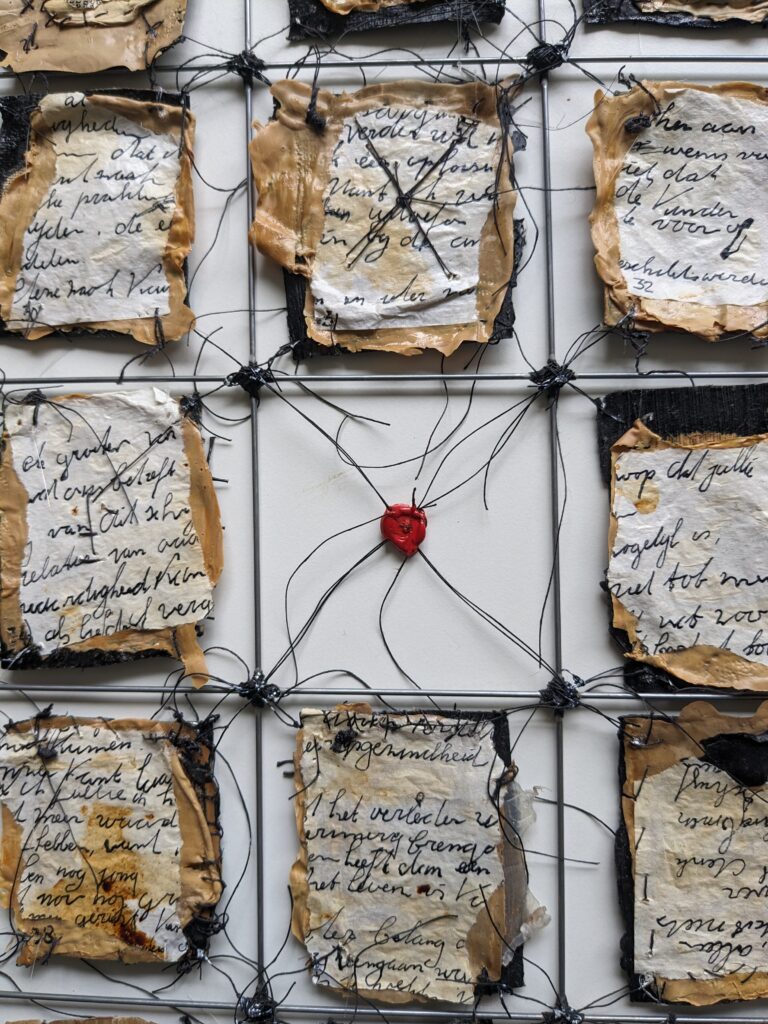 Voor Ria is draad niet alleen een constructiemateriaal, maar een veelzijdig element met meerdere functies. Het kan elementen met elkaar verbinden, van papier en metaal tot glas en hout. Daarnaast bekijkt Ria draad ook op andere manieren: als streep, grens of tijdlijn. ‘Draden zijn altijd, in meerdere hoedanigheden, een belangrijk onderdeel van mijn werk. Je zou kunnen zeggen dat de imperfectie van mens en natuur als een rode draad door mijn werk loopt – niet alleen letterlijk in het materiaal, maar ook conceptueel in de thema’s die ik onderzoek.’